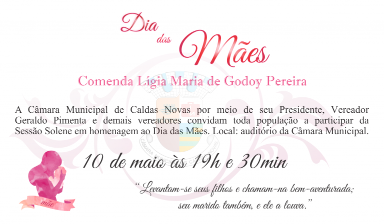 Câmara Municipal de Caldas Novas por meio de seu Presidente, Vereador Geraldo Pimenta e demais vereadores convidam toda população a participar da Sessão Solene em homenagem ao Dia das Mães. Local: auditório da Câmara Municipal. O evento acontece a partir das 19 horas e 30 minutos.