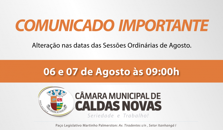A Câmara Municipal de Caldas Novas informa que a 3ª e 4ª sessões ordinárias do mês de agosto, marcadas para os dias 16 e 17 de agosto de 2018 foram transferidas para as seguintes datas: 3ª Sessão Ordinária dia 06 de agosto, segunda-feira e 4ª Sesssão Ordinária 07 de agosto, terça-feira. Contamos com a presença de todos acompanhar e divulgar o trabalho realizado pelo legislativo municipal.