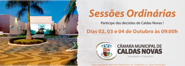 Dias 02, 03, 04, 16 e 17 a Câmara Municipal de Caldas Novas realizará as Sessões Ordinárias do mês de Outubro. Acompanhe o trabalho do seu vereador, ou assista ao vivo no site www.camaradecaldas.go.gov.br . Participe !