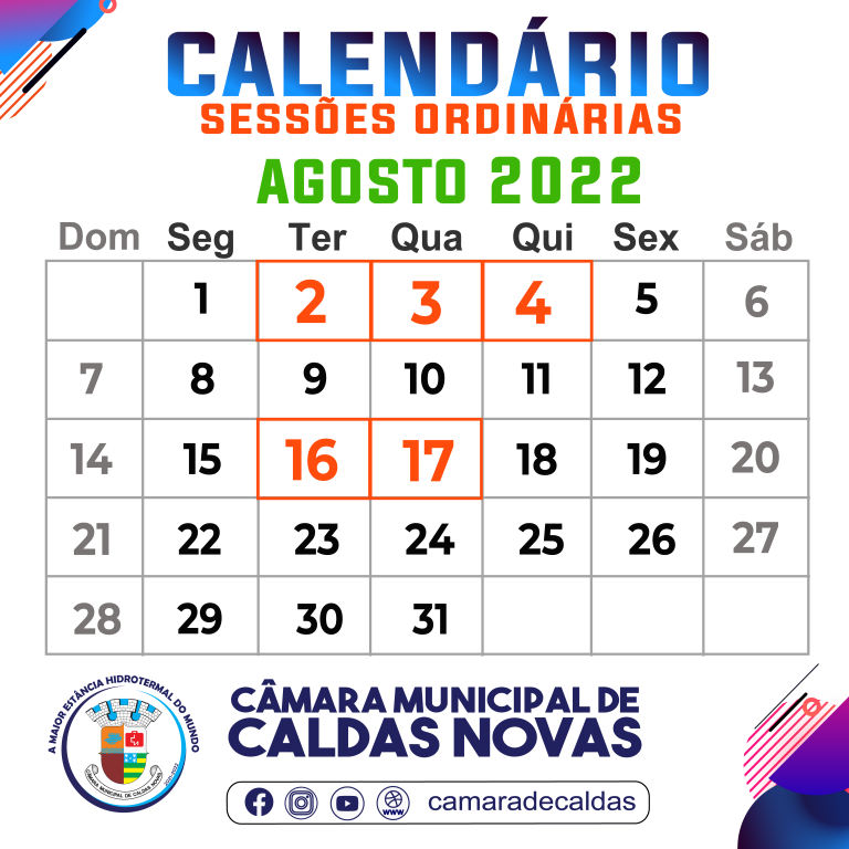A Câmara Municipal de Caldas Novas por meio de seu presidente Marinho Câmara e demais vereadores divulga o calendário das sessões ordinárias programadas para o mês de agosto de 2022.As sessões são realizadas sempre às 09 horas da manhã no Paço Legislativo Martinho Palmerston, podendo ser acompanhadas presencialmente ou ao vivo no nosso facebook e portal na web pela TVCâmara: Acesse nossos canais oficiais:🌐 | www.camaradecaldas.go.gov🖥️ | Câmara Municipal de Caldas Novas📲 | instagram.com/camaradecaldasTexto: Marlus Alberto – Relações Públicas da