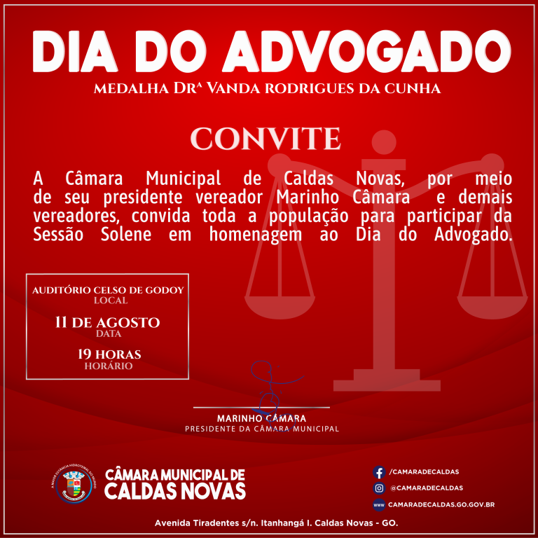 A Câmara Municipal de Caldas Novas realizará no dia 11 de agosto a Sessão Solene em Homenagem ao Dia do Advogado. A cerimônia em homenagem aos profissionais do direito foi instituída a partir da Lei Municipal nº 2.435/2016 no âmbito do município de Caldas Novas. Durante a Sessão os seguintes homenageados receberão a Medalha Drª Vanda Rodrigues da Cunha: Vereador Andrei Barbosa – Dr. Heli Pimenta Carneiro Vereador Claudinho Costa – Drª Rafaela Cristina Delfino Vereador Daniel Caldeira – Dr.