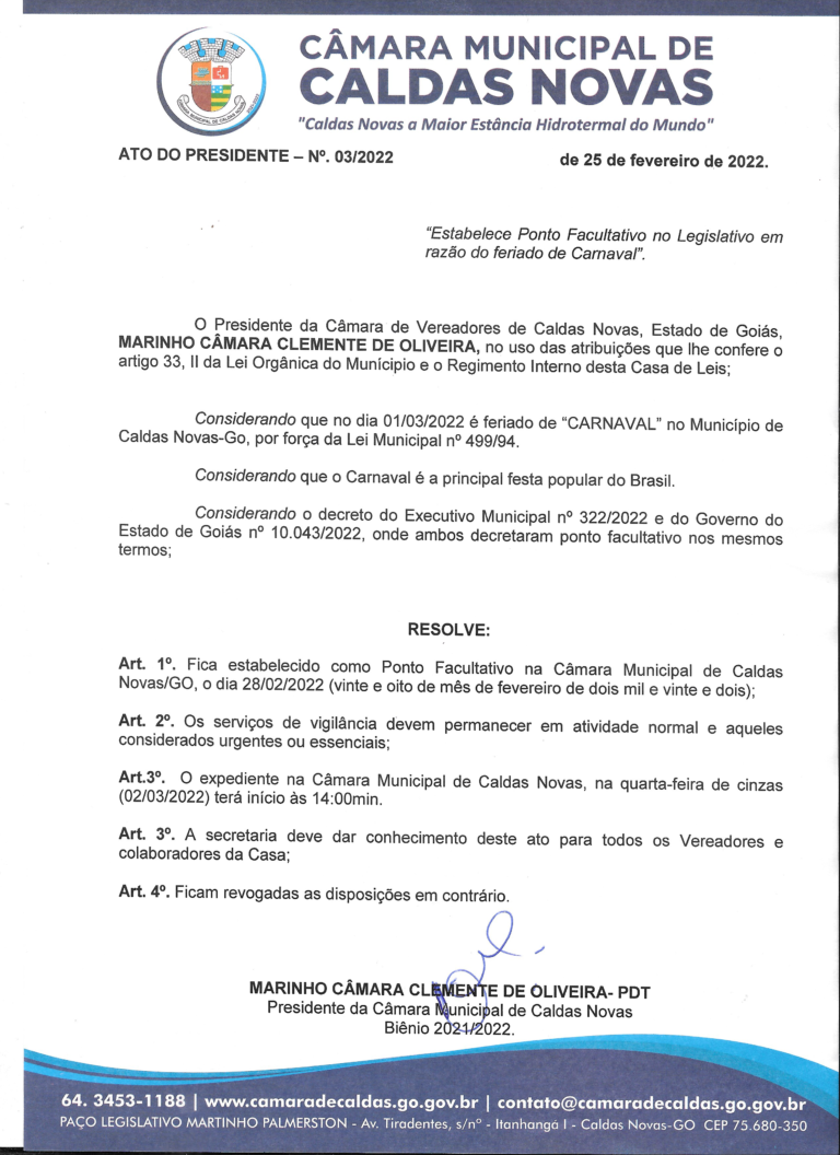 O Presidente da Câmara Municipal de Caldas Novas, Marinho Câmara, estabeleceu ponto facultativo no legislativo em razão do feriado de Carnaval. O Ato 003/2022 foi publicado no portal da Câmara Municipal e pode ser acessado na aba “Atos e Decretos”. Fica estabelecido como ponto facultativo no dia 28 de fevereiro, segunda-feira, e na quarta-feira, 02 de março, o expediente terá início às 14 horas. Quaisquer informações adicionais acesse nossos canais oficiais:🌐 | www.camaradecaldas.go.gov🖥️ | facebook.com/camaradecaldas📲 | instagram.com/camaradecaldasTexto: MARLUS ALBERTO –
