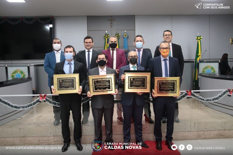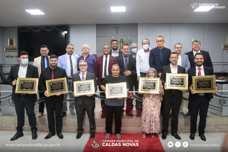 A Câmara Municipal de Caldas Novas realizou nessa quarta-feira, 08 de dezembro, a Sessão Solene para Entrega de Títulos de Cidadão Caldasnovense de autoria dos vereadores Hudson Matheus e Weuller Gonçalves. O evento aconteceu na sede da Câmara Municipal: Paço Legislativo Martinho Palmerston. Com a presença do presidente da Câmara Municipal Marinho Câmara, o prefeito Kléber Marra, os vereadores Everton Jamal, Paulo da Laranja, Ronan Maia e Saulo Inácio, além de autoridades municipais. Os homenageados que receberam o título de