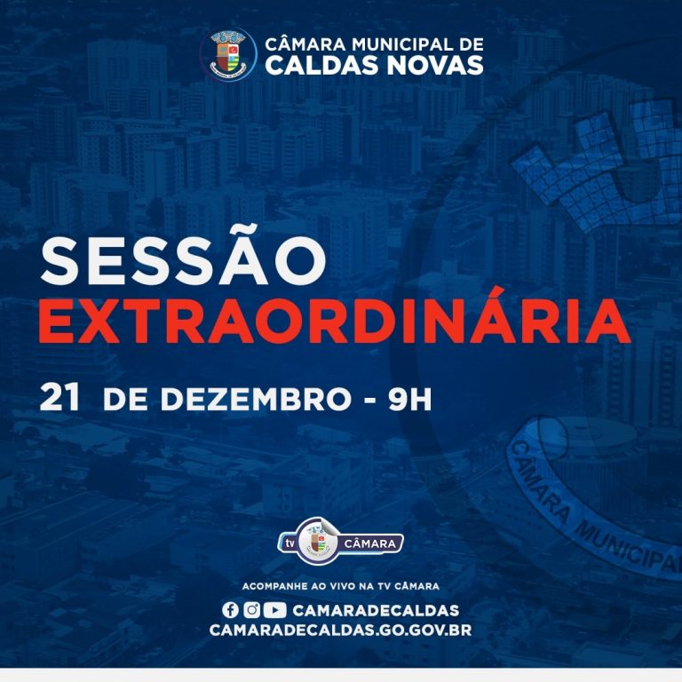 O presidente da Câmara Municipal de Caldas Novas, vereador Marinho Câmara, convocou os vereadores de Caldas Novas para uma sessão extraordinária a ser realizada na próxima terça-feira, 21 de dezembro, com o objetivo de deliberar sobre os projetos de lei municipal enviados em caráter de urgência para o legislativo. A sessão acontecerá no plenário da Câmara, Paço Legislativo Martinho Palmerston, à partir das 09 horas, com transmissão ao vivo pela TVCâmara. A solicitação para a realização desse tipo de sessão