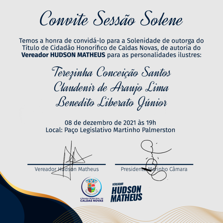 O presidente da Câmara Municipal de Caldas Novas, Marinho Câmara e os vereadores Hudson Matheus e Weuller Gonçalves convidam toda a população para a Sessão Solene para Entrega de Títulos de Cidadão Caldasnovense a ser realizada no dia 08 de dezembro, quarta-feira. O evento acontece na sede da Câmara Municipal de Caldas Novas: Paço Legislativo Martinho Palmerston, à partir das 19 horas. Os homenageados que receberão os títulos de cidadão honorífico de Caldas Novas de autoria do vereador Hudson Matheus