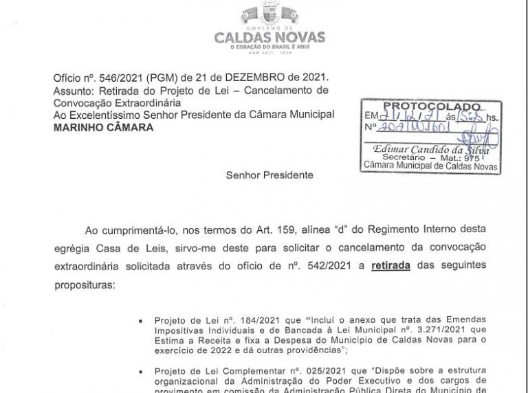 A Prefeitura Municipal de Caldas Novas, por meio do prefeito Kleber Marra, solicitou a retirada das matérias que seriam discutidas na sessão extraordinária dessa quarta-feira, 22. O ofício nº456/2021 solicitando a retirada e o cancelamento da sessão foi recebido no período da tarde pela secretaria legislativa da Câmara Municipal de Caldas Novas e o pedido acatado pela presidência da Câmara. Ao todo eram dez projetos que estavam em pauta na sessão iniciada no dia 21 de dezembro e que foi