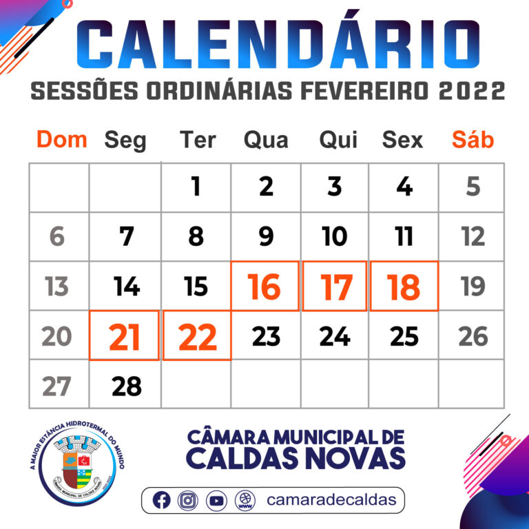 A Câmara Municipal segue trabalhando, as sessões ordinárias se iniciam em fevereiro conforme o Regimento Interno. Confira o Calendário! As sessões do próximos meses di primeiro semestre já estão marcadas, basta acessar a nossa agenda no portal da Câmara Municipal. Acesse nossos canais oficiais: | camaradecaldas.go.gov | Câmara Municipal de Caldas Novas | instagram.com/camaradecaldas Fonte: Comunicação Câmara Municipal de Caldas Novas